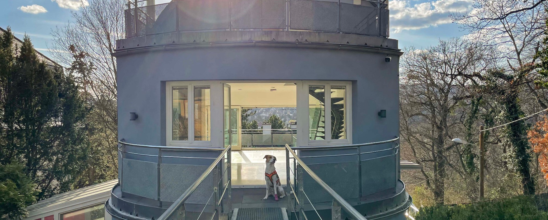 MARTHA ist ein Looshaus und nicht nur von Außen ein richtiger Hingucker. 260 m2 sind auf vier verschiedenen Ebenen aufgeteilt und jeder Stock hat sein eigenes stilvolles Design: Vom Erdgeschoss mit Sportraum und Saune, rauf zum oktogonalem Zimmer mit Terrasse, über den großen Koch- und Wohnbereich mit Wintergarten und Steg zum Garten bis hin zur Kuppel - ein Dachgeschoss mit Balkon. Die großzügige Garage bietet Platz für bis zu drei Autos. MARTHA ist ideal geeignet für Liebhaber*innen von architektonischem Design, die auf der Suche nach einem ruhige aber extravaganten Zuhause sind.
